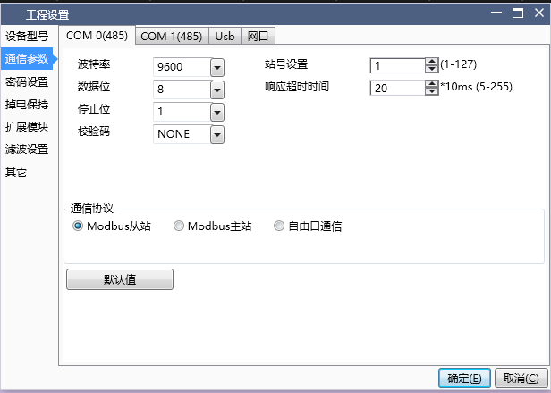 Timeout: This parameter only takes effect during Modbus master communication and has no practical significance for slave and free port communication. It represents the maximum waiting time for the PLC to receive one packet of data from the slave each time it communicates as the master, with a default value of 20 * 10ms;