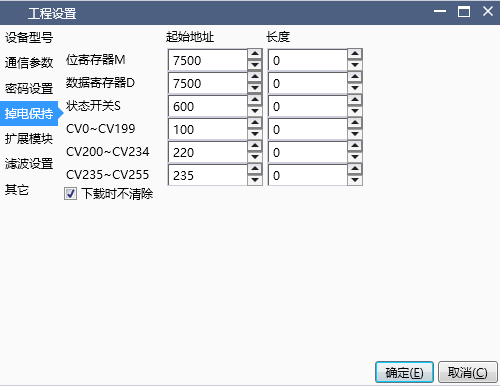 On this page, you can set the capacity of the power-off hold area. When you click on the default settings, the current settings will be cleared and the starting address of the power-off hold area will be set to the minimum value, and the length will be set to the value shown in the image.