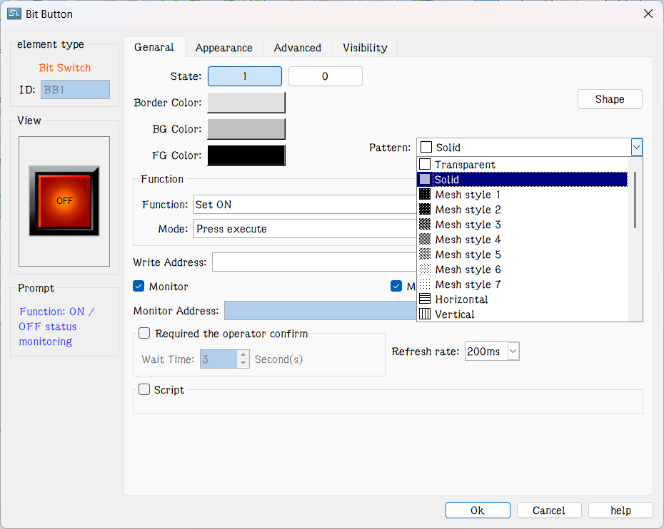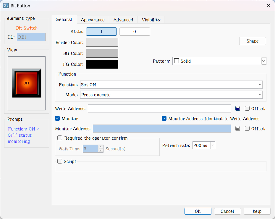 u Monitor: Select "Monitor" to display the "Monitor Address”, indicating that the "bit button" can be used to monitor the value change of "Monitor Address". The value of the Monitor address is 0 / OFF when the bit button is in the 0 / OFF state; and the value of the Monitor address is 1 / ON when the control is in the state of 1 / ON. When "Monitor Address" is chosen, the monitor address and write address can be different. For example, when it selects the Set function, touching this control makes set the write address to 1 / ON; but if the monitor address is at 0 / OFF at this time, the bit button will still display 0 / OFF state. Generally, users choose "Monitor address identical to Write address" in order to reflect or display directly the state value you write.