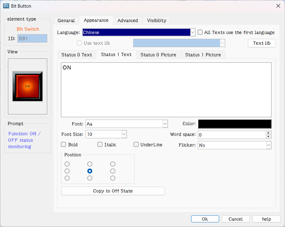 Bit button is used to operate and display the ON/OFF status or 1/0 status of the bit address of the device connected with the touch screen. Bit button is the most fundamental and frequently used control.