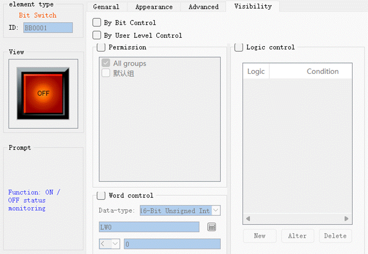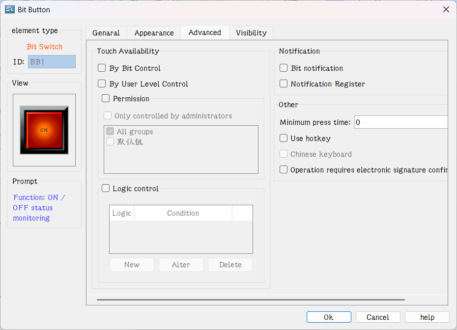 l Controlled by User Level: When User Level Controlled is chosen, the conditions will be the same as those in the User Level Controlled option in Advanced page, and only when such conditions are met the Bit Button can be displayed on the touch screen.
