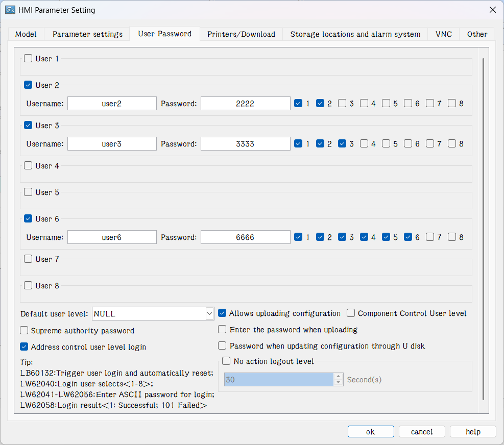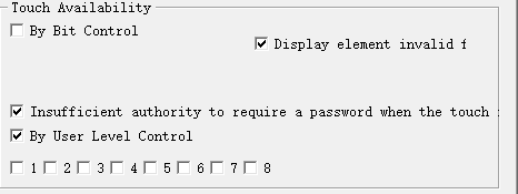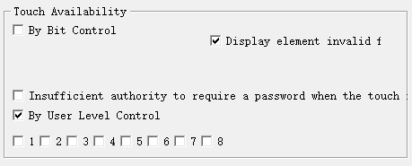 If Default User Level is NULL, this control is not touchable, and in this case you can use Change User Level in Function buttons to change the default level. For example, if the password entered by the user is 6666, corresponding to User Level 6, but the user chooses only option 1, not matching option 2 or 3, so the system will prompt that the password is incorrect; When the password entered by the user is 2222 or 3333, as both users have option 2, matching option 2 or 3, the password is valid and this control will be changed to a touchable control. If the Default User Level is user 2 to 3, then both user levels have option 2 to match the touching conditions, and then this control is touchable in simulation or initialized screen; If the Default User Level is user 6, then this user level does not have an option to match the touching conditions, and then this control is not touchable in simulation or initialized screen. The default setting is as shown in figure below: