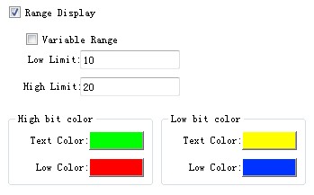 l Display Range: When this option is selected, user can set the lower and higher limit values as well as the low and high-level background color according to the needs. The address value monitored (read) by the control will be represented by different color patterns in the user-set lower and higher limit values.