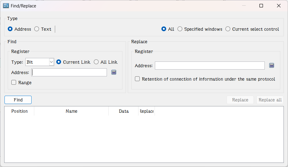 Find/Replace (Ctrl+F) : Use this shortcut key to pop up a Find/Replace window. On this window, the usage of a certain address or a special text can be listed, and the target position can be precisely located based on the filtering conditions. At the same time, return the information of the used controls to the list below. Double-click the corresponding text to open the corresponding control information page.