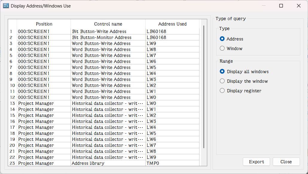 Address Search: Query the use of an address and list the information of control occupying this address; double-click the information item to select the control.