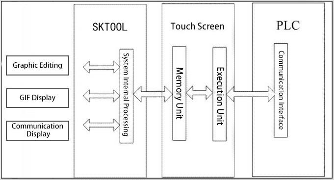 SKTOOL is a configuration editing software of Samkoon HMI. SKTOOL allows engineers to edit the configuration on the PC, and then download the final configuration and required communication driver to communication and the required driver to the storage mechanism of the touch screen with a USB cable; HMIs can be controlled and monitored after being connected to PLCs or other connection devices through actuators and serial communication ports. Figure 2-44 shows SKTOOL system composition.