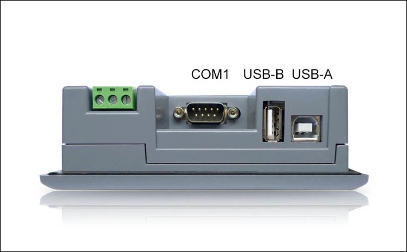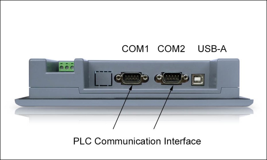 Communication ports of HMI are located in the bottom panel. Models of SK-121F,SK-102H,SK-102C,SK-070G,SK-070M,SK-070H,SK-070F provide two standard serial communication ports while those SK-035F,SK-035U,SK-043F,SK-043H,SK-043U,SK-050H adopting a 9-core D-type interface for connection to a PLC or other controller and also for communication, provide one standard serial communication port.