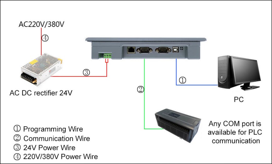 Samkoon SK series touch screen requires DC 24V power supply. Figure 1-18 shows the connection of the touch screen with PLC and PC: