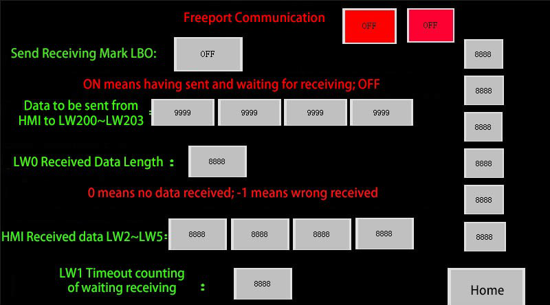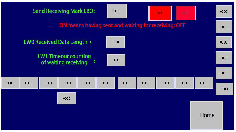 The six controls on the right side of Configuration 1 and 3 are numeric display controls whose monitoring addresses are respectively LW60297, LW60298, LW60299, LW60300, LW60301 and LW60302 = 1, from top to bottom. Two red controls are that of bit indicator light whose monitoring addresses are LB100 and LB101, respectively. Controls below Configuration 3 are numeric display controls, starting at address LW400 with an address interval of 1.