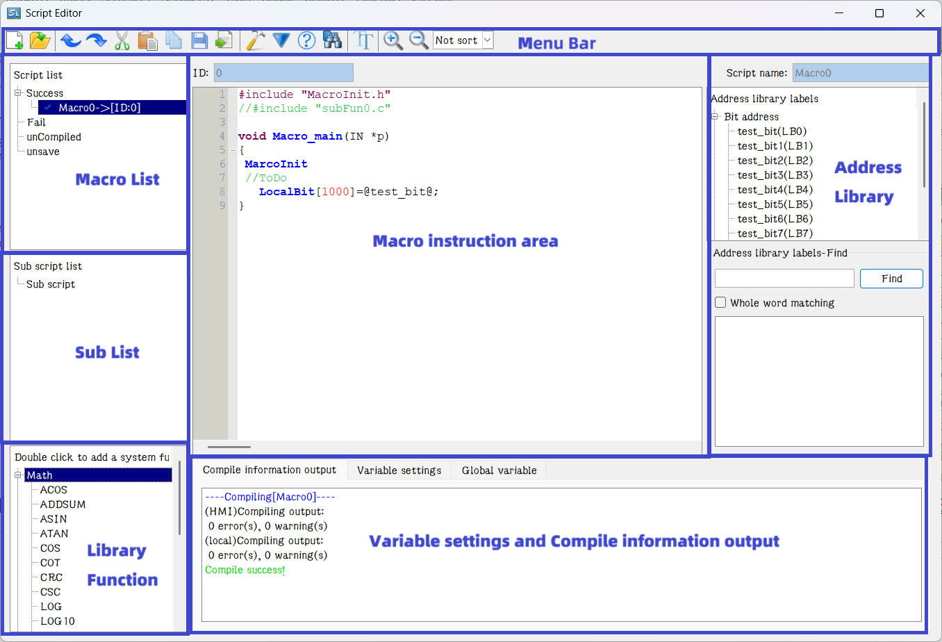 <2> Script Edit window: Edit and compile script on this window。 “ID”:The number of the current edit script,“Script”:Modify the name of the current edit script.