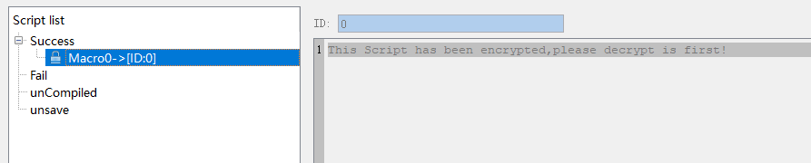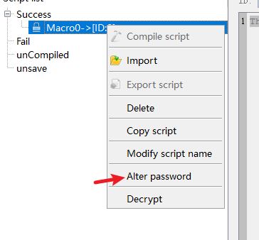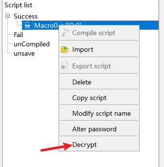 Select the macro to be decrypted, right-click to select the "Decrypt" function, and enter the password set during the encryption process according to the prompts