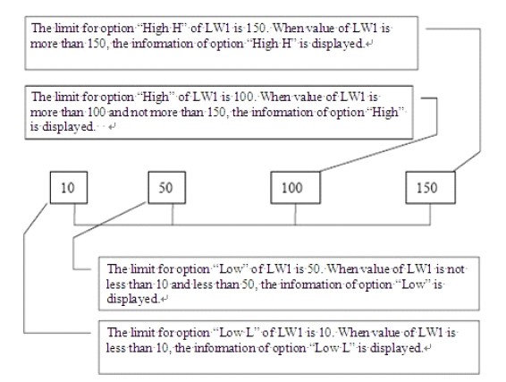 l Click each item to input a value in the “Limit” box on the right; then enter the text information (alarm content) in the “Text" box. Here assume that the message is as shown in Figure 7-28: each address value can be classified into one of four ranges-- Low, Low Low, High, High High.