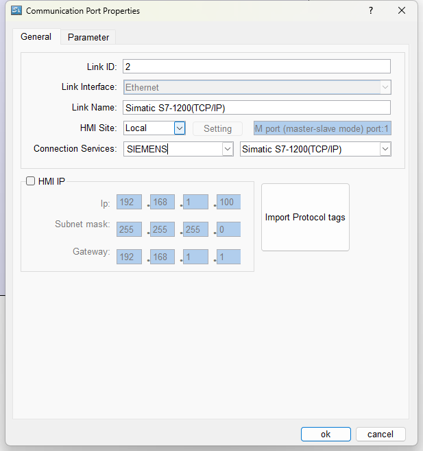 Communication port property is applied to set the communication parameters between HMI and connected devices. HMIs like SK-121F,SK-104F,SK-102H,SK-102C,SK-070G,SK-070M,SK-070F,SK-070H are equipped with two communication ports, COM1 and COM2, supporting simultaneous communication with two different PLCs; and parameters of each port must be set. HMIs like SK-050H,SK-043U,SK-043F,SK-043H, SK-035U,SK-035F have one communication port, COM1, and it communicate only with one connected device.