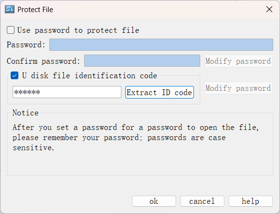 (1) Check the "U disk file identification code" option, enter the password in the input box, click "Extract ID code", and select a path to generate the file "skconfigkey.bin".
