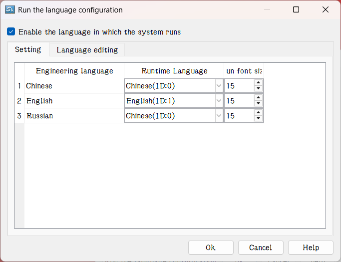 Check the "Enable system runtime language" button to display the configuration of the number of languages just set on the Multi-language settings page. Here you can select the project runtime language and runtime size for the corresponding language. SKTOOL has many built-in languages, the list is shown below: